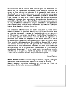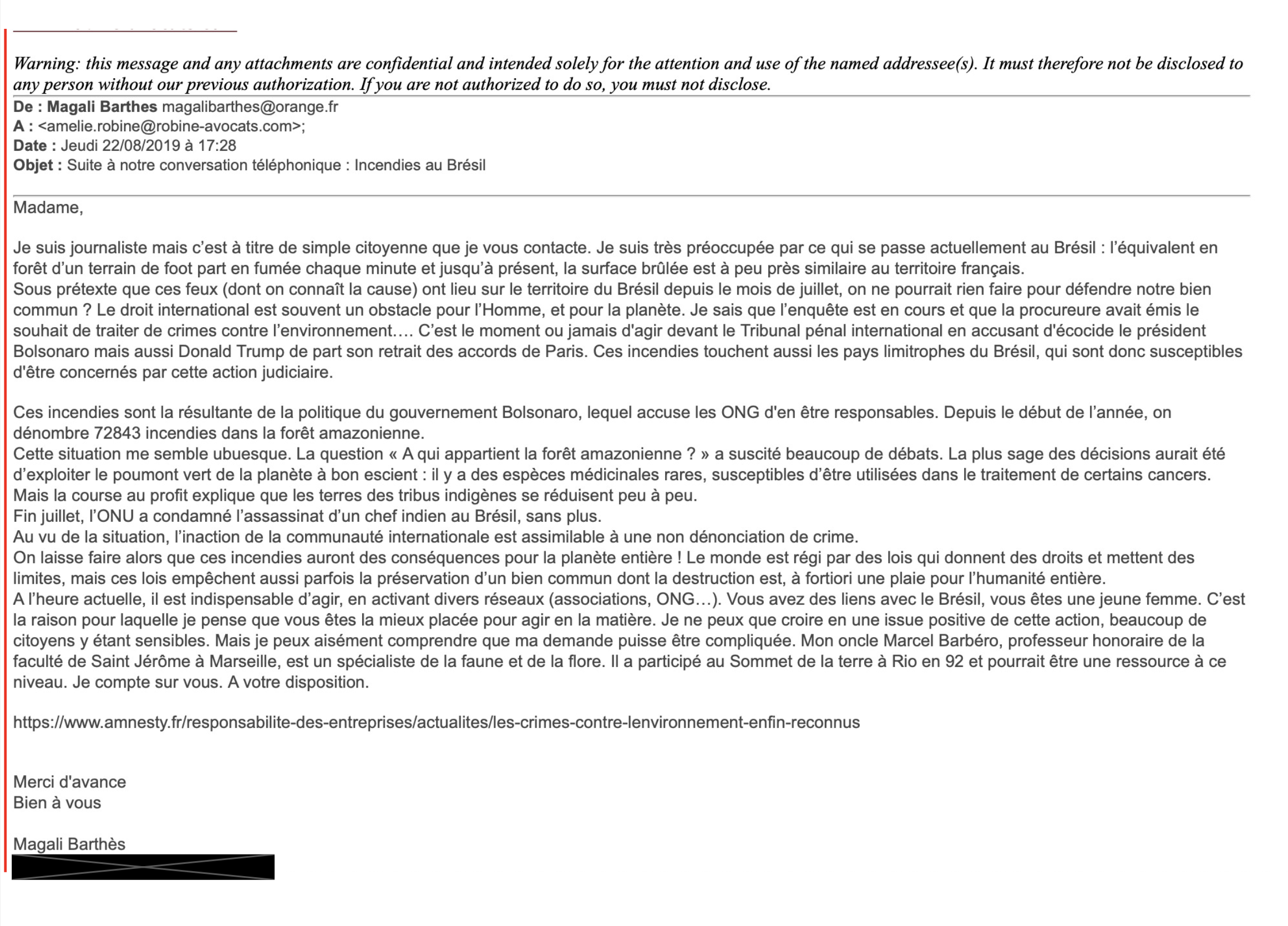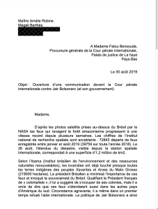 Lettre envoyée à titre gracieux à Maître Amélie Robine en vue de l’ouverture d’une communication devant la Cour pénale internationale