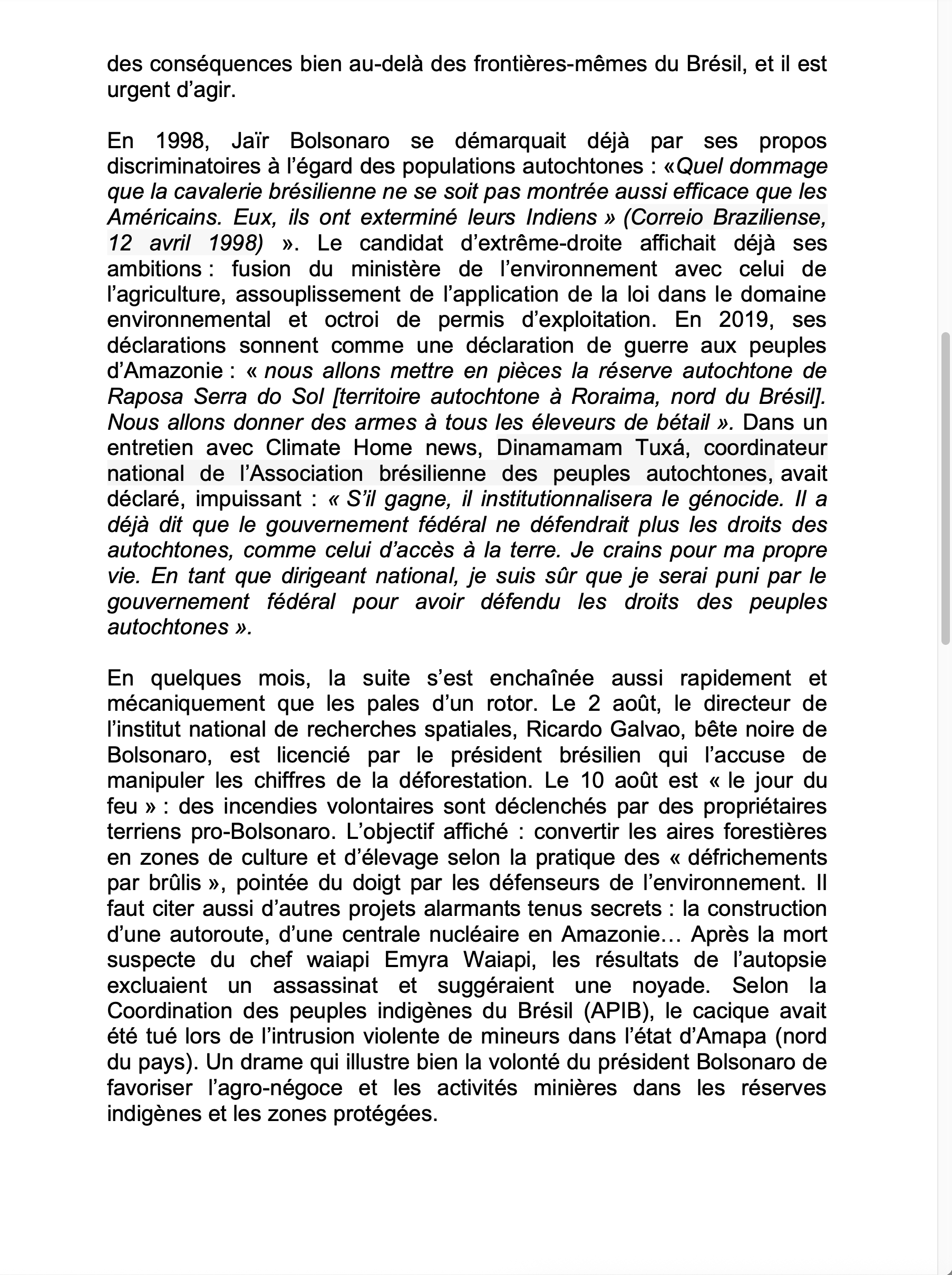 2019 : Création d’une cagnotte pour le peuple Surui, en Amazonie brésilienne. Leur chef Almir, connu pour avoir porté plainte contre Jaïr Bolsonaro aux côtés du cacique Raoni, lance un appel aux citoyens. Les peuples autochtones sont les garants de la forêt amazonienne, trésor méconnu de biodiversité qui servira à la production de médicaments. En aidant les Surui, vous aiderez aussi la planète en général. https://urls.fr/OO6Ves